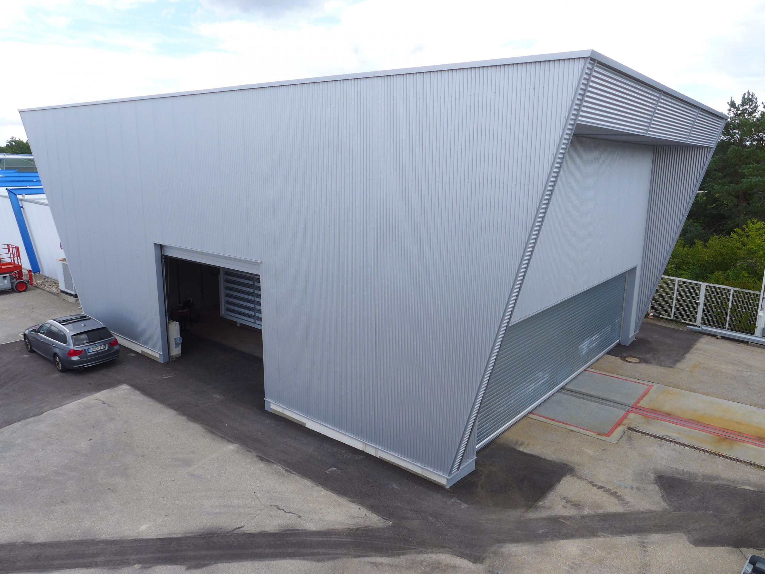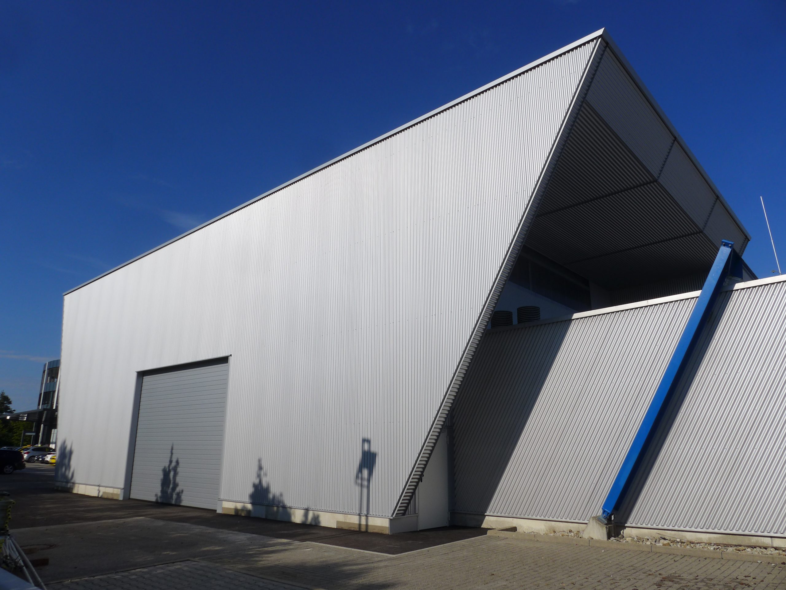 Hallenkonstruktion trapezförmig, Grundriss Dach ca. 23,5 x 12,5 m inkl. Fassadenverkleidung Welle einschalig und Dachabdichtung isoliert.